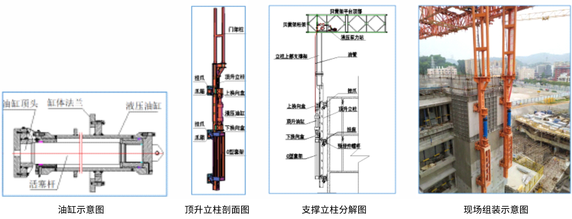 · 鋼平臺系統(tǒng):321型貝雷架連接組成(長300X高150 CM); · 支撐系統(tǒng):導(dǎo)軌立柱、門架柱及附墻導(dǎo)座; · 動力及控制系統(tǒng):小行程、小噸位液壓油缸; · 模板系統(tǒng):鋁合金模板; · 掛架系統(tǒng):輕型吊掛架; · 安全防護(hù)系統(tǒng):平臺上部防護(hù)、走道板。 |