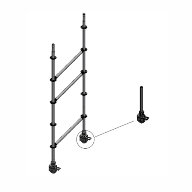 | 1. 腳手架塔須由至少2名工作人員操作。有關(guān)適當(dāng)培訓(xùn)的詳細(xì)信息,請與您的供應(yīng)商聯(lián)系。應(yīng)用制動(dòng)器,并將可調(diào)整的腳輪安裝到立柱管內(nèi)。 | 2. 將2個(gè)水平橫桿安裝在立柱的連接盤內(nèi)。參見放大視圖。 |