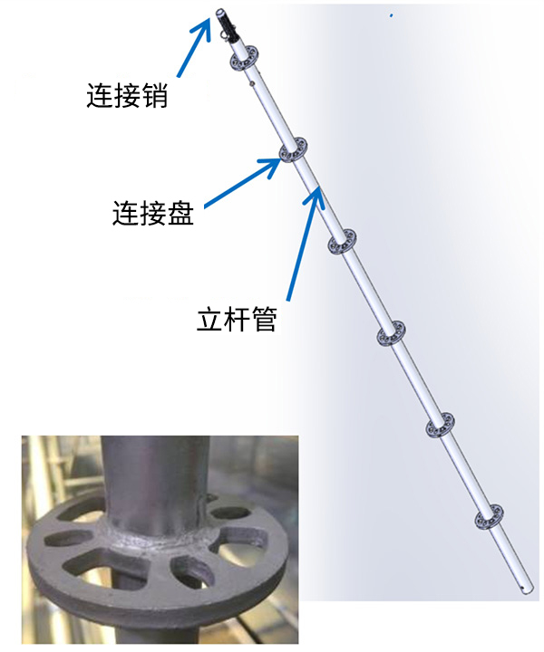 ② 管體每隔500MM設(shè)置焊接8孔連接盤;各桿件軸心交于一點(diǎn)。架體受力以軸心受壓為主,由于有斜拉桿的連接,使得架體的每個(gè)單元近似于格構(gòu)柱,因而承載力高,不易發(fā)生失穩(wěn)。 ③ 連接銷固定于立桿一端,用于立桿豎向接長的內(nèi)插管。 |